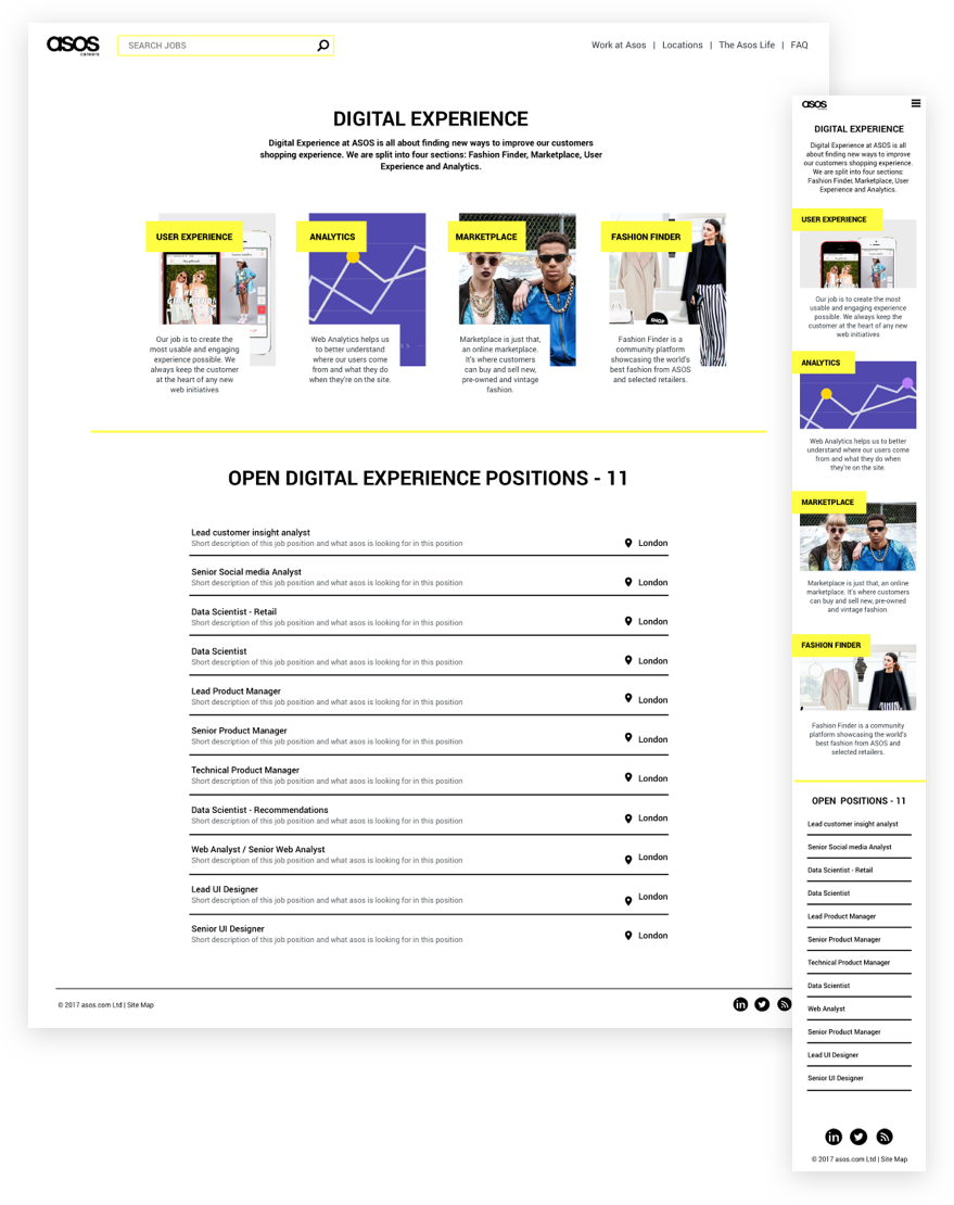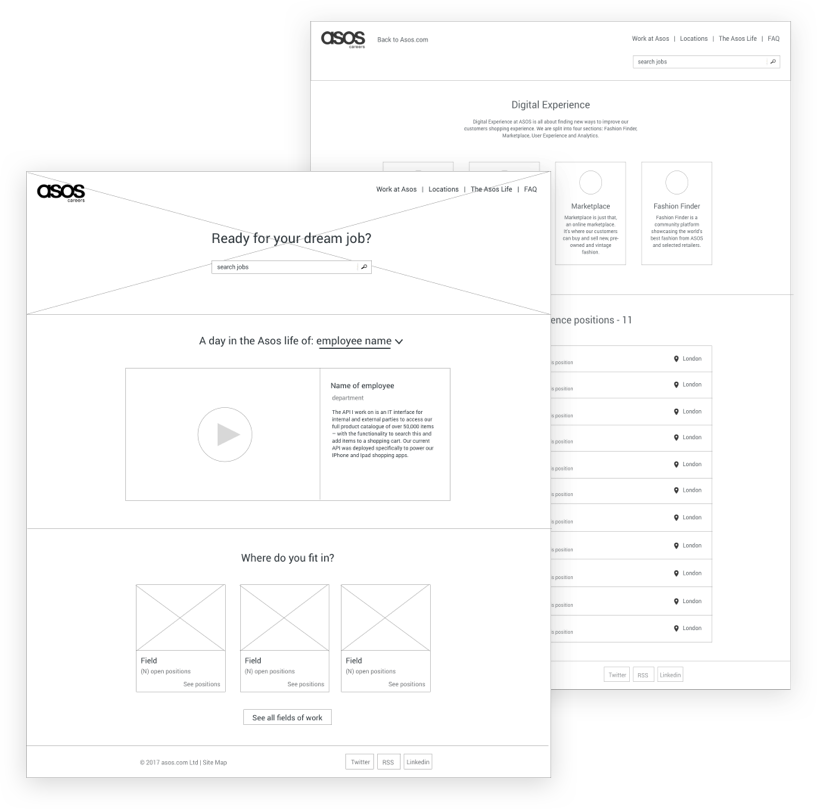 My objective for the wireframes was very specific - create excitement among job seekers, and make them absolutely want to work for Asos. To achieve this, I added the “Day in the life” category to the homepage, to show potential candidates how great it is to work for Asos.