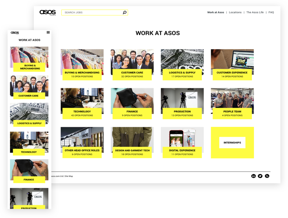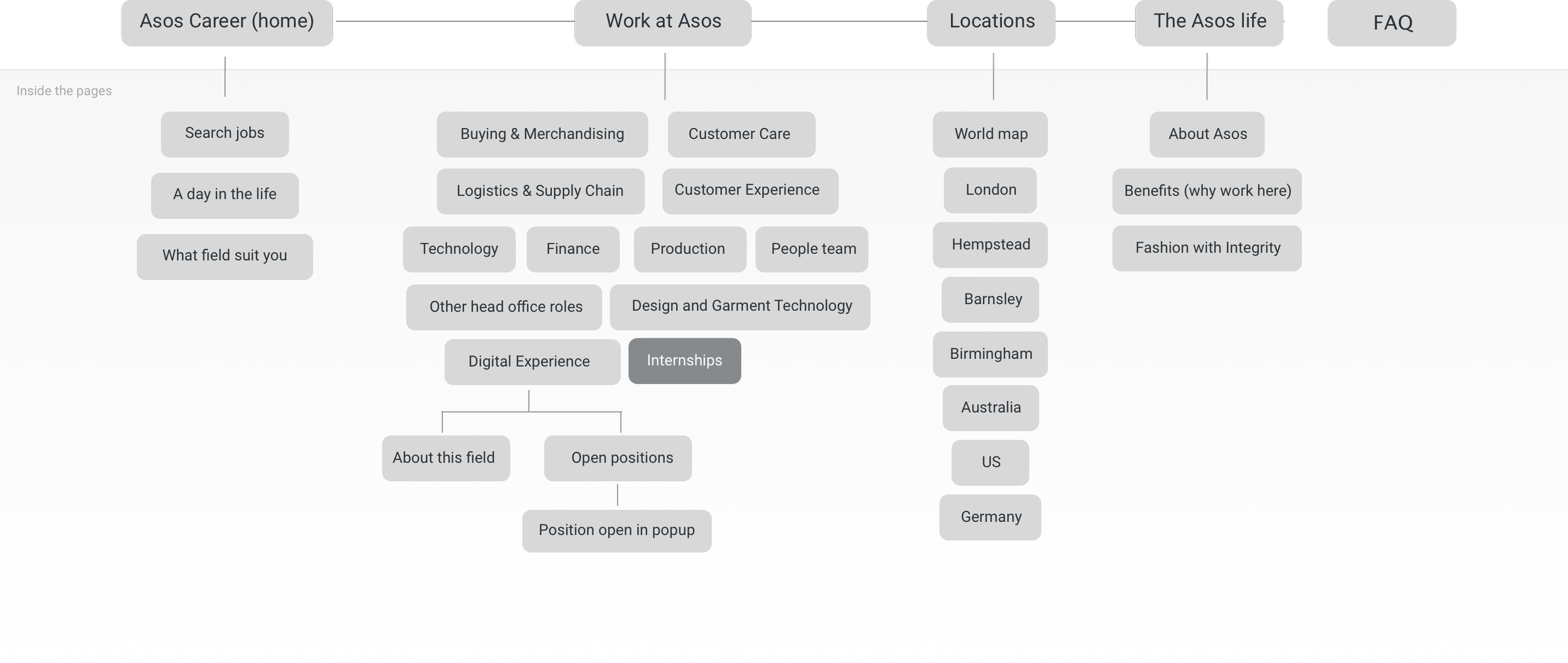 I ended up with these main categories: Work at Asos, Locations (given the company size, I felt this is crucial), Asos Life & FAQ.